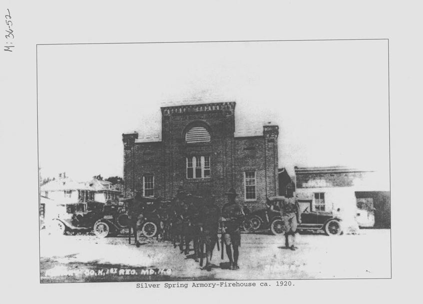 Here, from the Silver Spring Fire Department’s “Our History” page, is a photo of the old firehouse in operation, from 1954. (That page is fascinating; give it a read!)