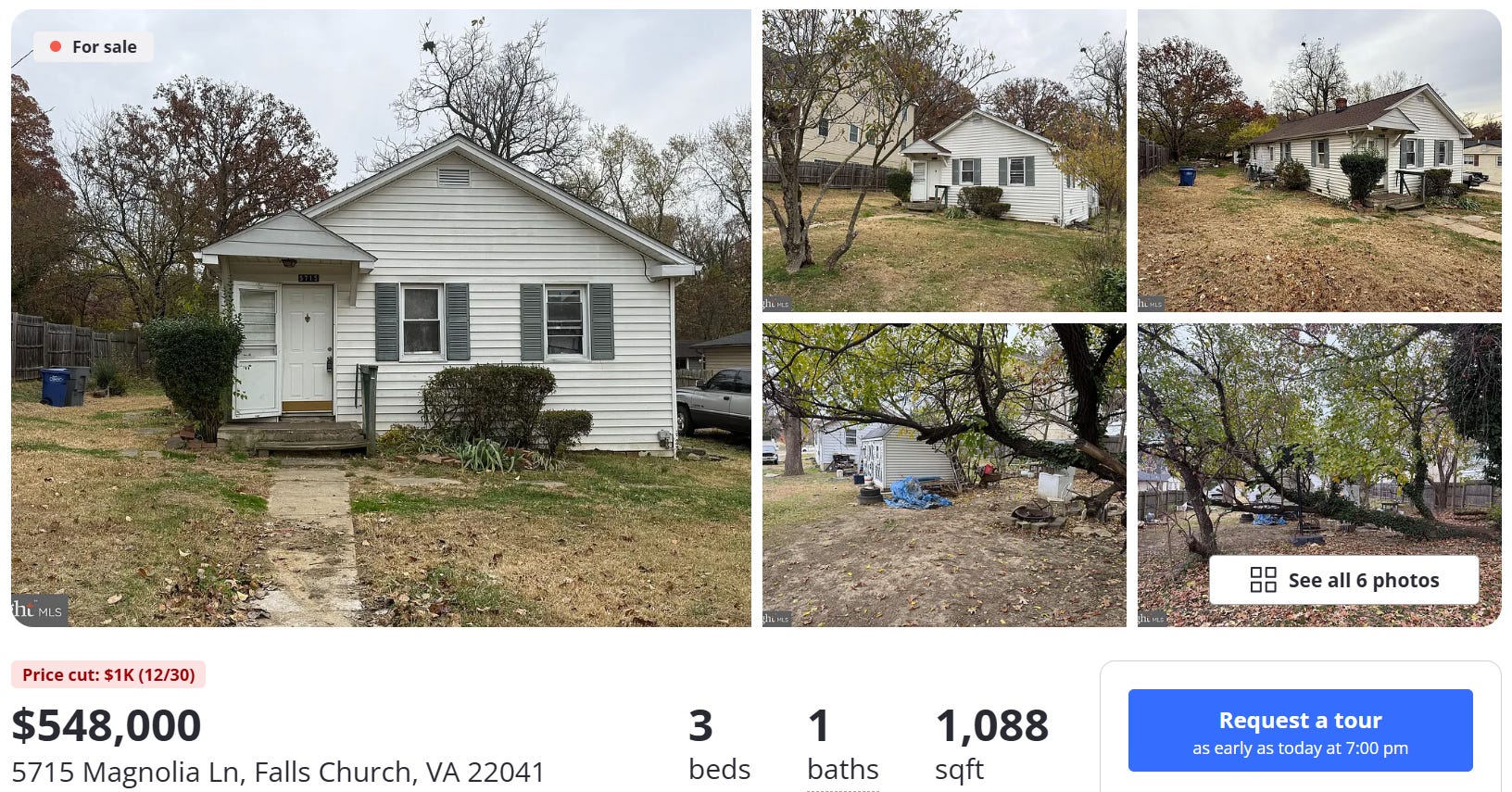 The cheapest detached, single-family house in the entire county available as of that date was this one, listed at $548,000 and sporting three bedrooms, one bathroom, 1,088 square feet, and, according to the listing, a build date of 1925.