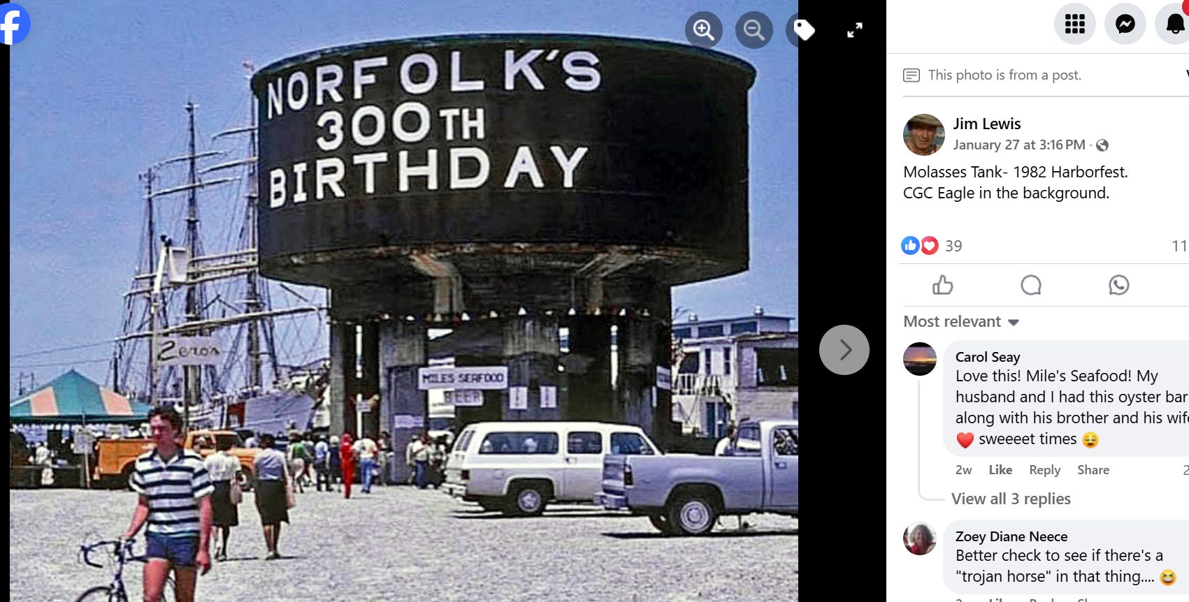 It’s an old molasses tank, located near the water. (Norfolk was 300 years old in 1982—wow. Norfolk was also one of the first cities to go all-in on urban renewal, and a great deal of its old urban fabric was demolished. Here are some photos—you would not know that the city had not been lev…