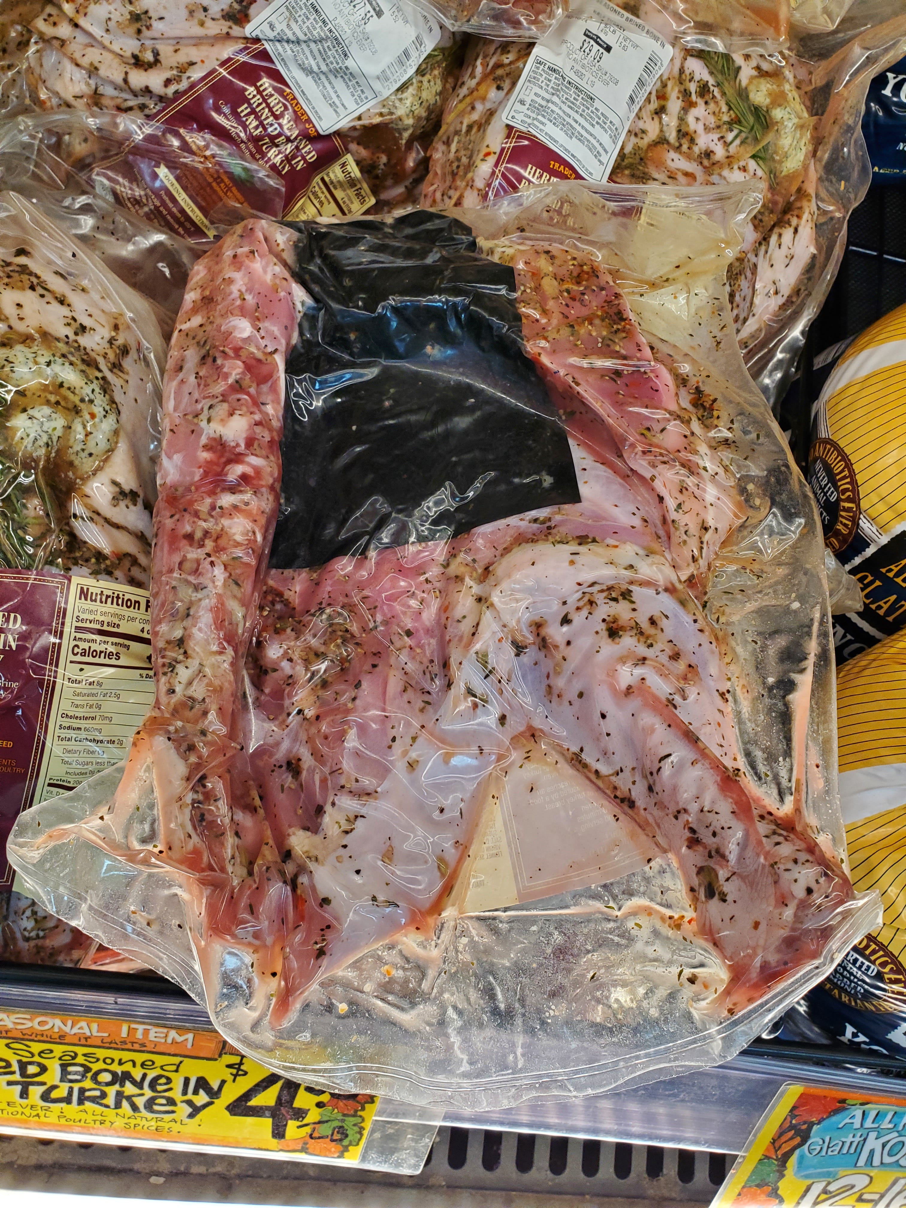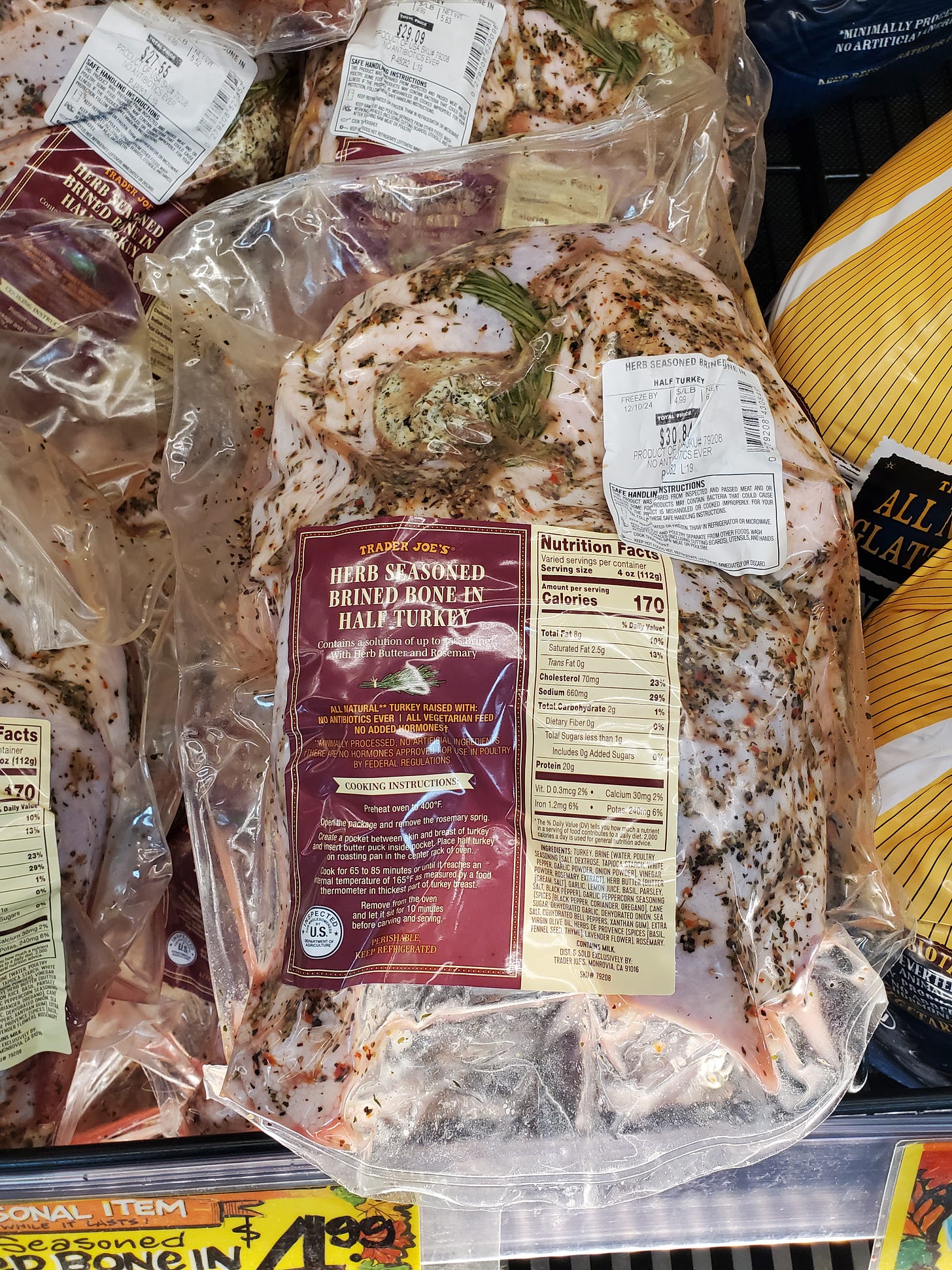 I read about this in the Trader Joe’s flyer before I saw it in the store, and as soon as I read about it I thought it was very interesting. It’s a bone-in half turkey, so basically a butterflied turkey with only one side. It’s marinated—very nicely, it looks like—and ready to cook.