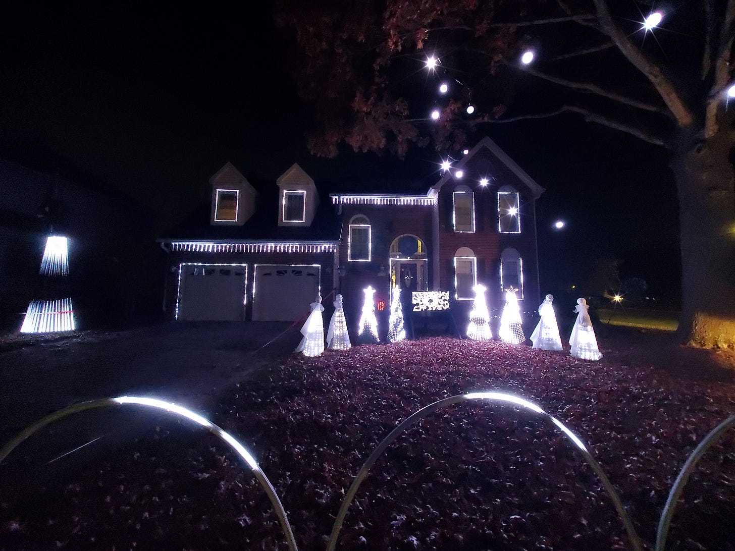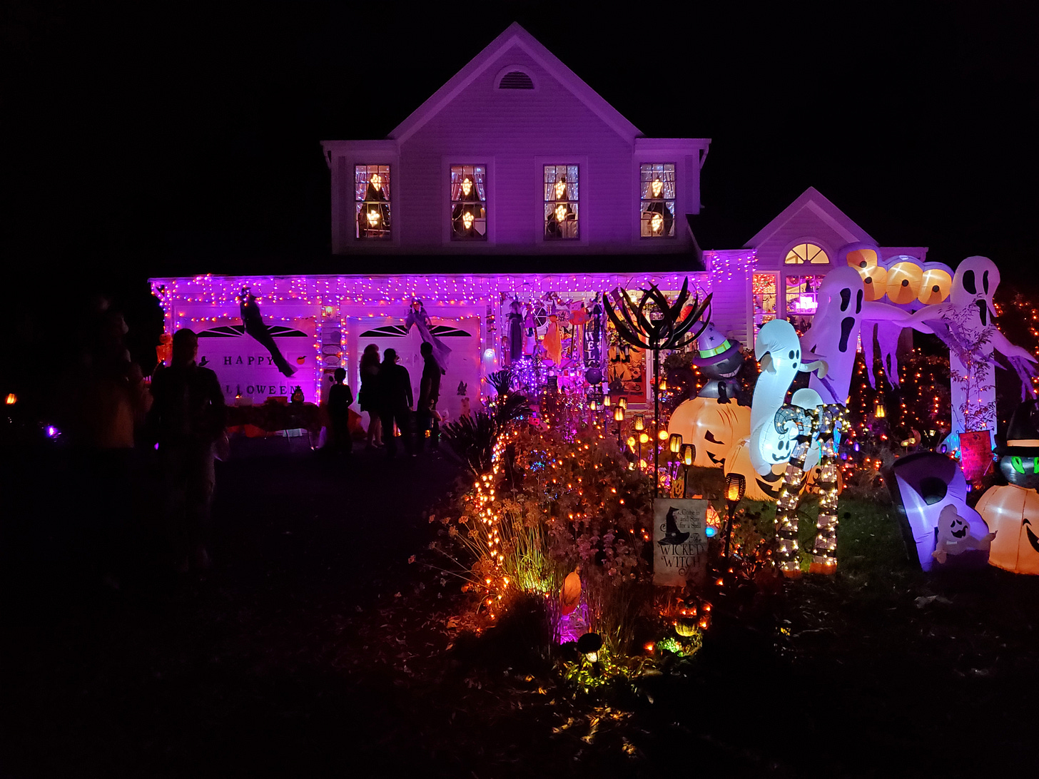 After the stream of trick or treaters died down, we went for a walk around the neighborhood. Past the big lawn display house, then the light-show house, where we met the owners and chatted and even had a little adult treat.