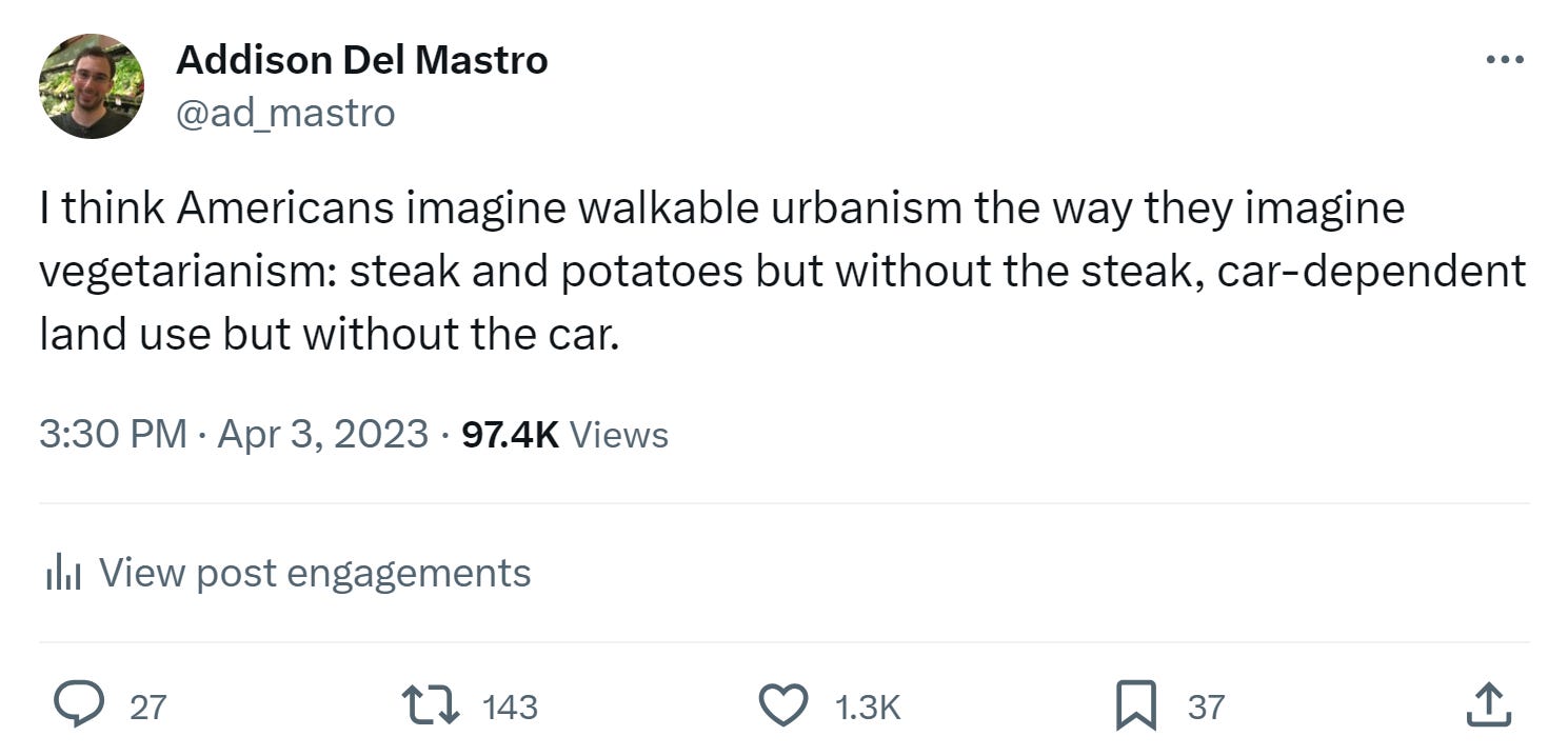 I raise this because I’m going to go back to my piece from two weeks ago, “15-Minute Suburbs,” and sort of question what I wrote. In that piece, I asked why, exactly, somebody in a mostly car-oriented suburb with a lot of shopping/services/amenities should want more walkability. Why—unless you have an environmental or equity argument—should car dependence matter to you? If you’re not a progressive, is there a philosophical avenue to supporting walkable urbanism? (Yes, but I was wondering aloud.)