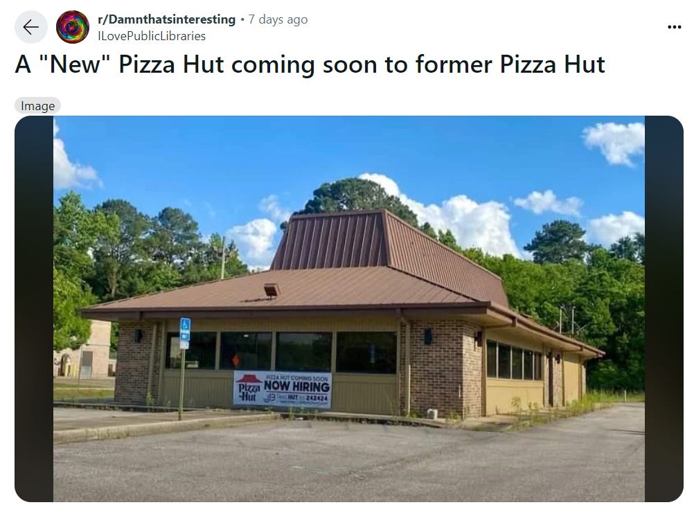 Unfortunately, this image is about a year old, and the building has since been demolished, with no signage at the old spot. Apparently, it was a false alarm—there was a new Pizza Hut down the road and the old site was used for advertising, for old time’s sake I guess.