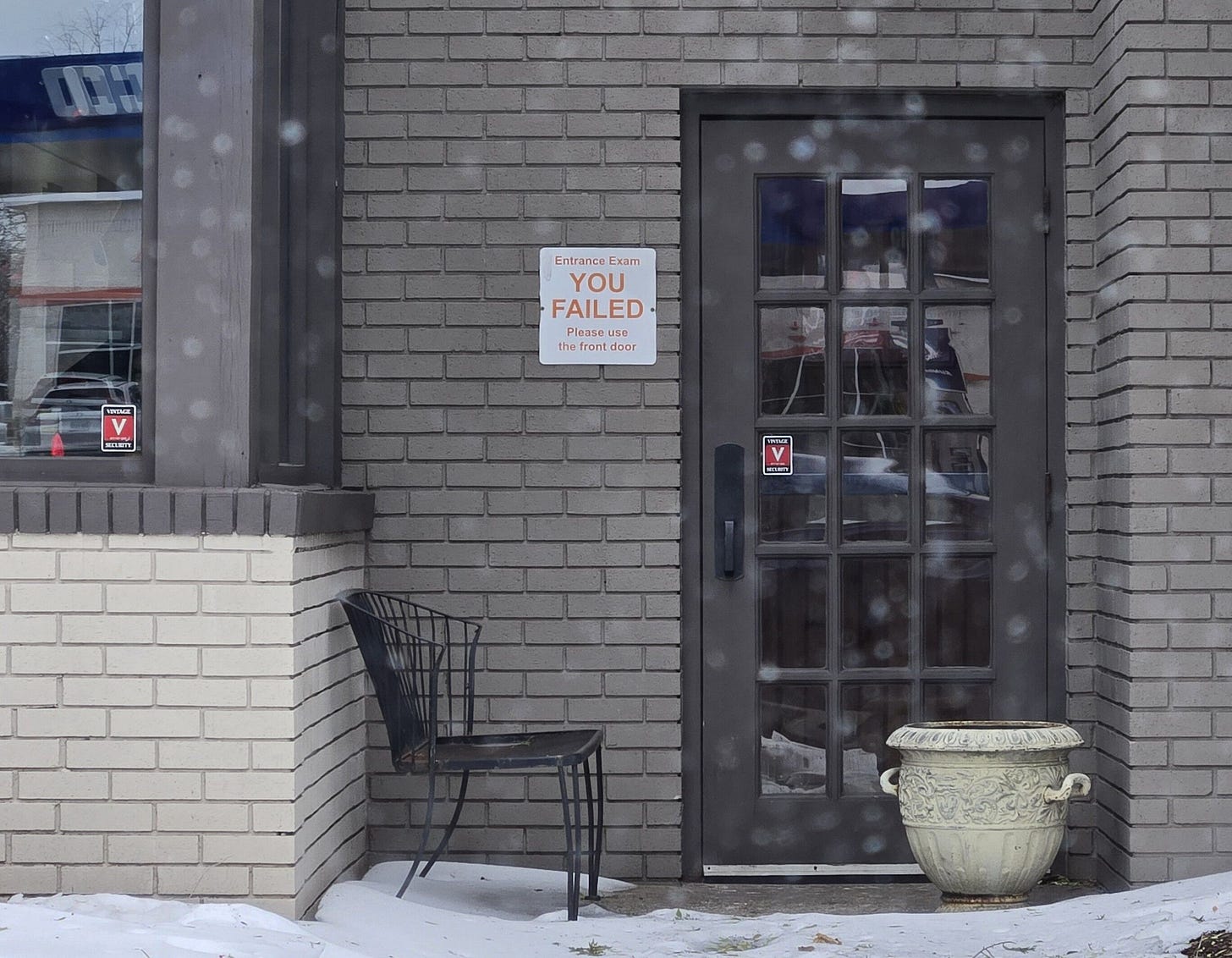Now I want to note, I can imagine the business owner’s side. Maybe the door is kind of obviously not the main entrance, yet people keep yanking at it, knocking, acting put out that it isn’t the entrance, etc. So the owner tacks that sign up to emphasize the point while having a little humor about it. Maybe it was once an entrance for a former occupant and the new interior no longer works with it being an entrance. Who knows. It’s not a big deal. It’s silly of me to pledge that I would never spend a penny there because I won’t pay for the privilege of being insulted. And perhaps this is exactly the kind of attitude the restaurant owners want to keep out.