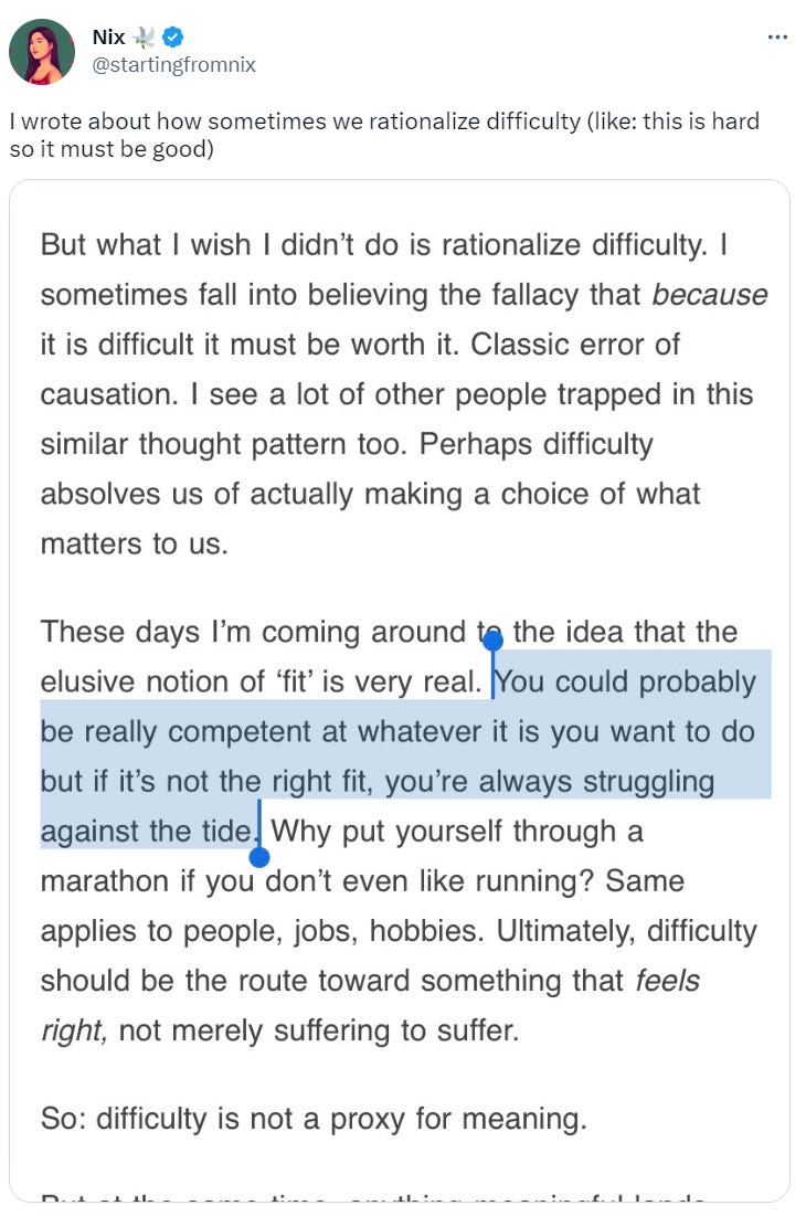 This resonates with me. I guess a few things—“Anything worth doing is hard”; the weird relationship Catholicism has with guilt and the idea that suffering is sort-of good; all the conservative talk about work ethic and deservingness and merit—can lead to this error, at least in my case.