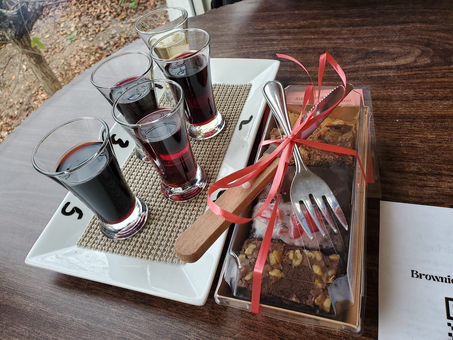 …and even offered this cool and reasonably priced self-guided brownie-and-wine tasting on our last visit, with homemade brownies in several varieties to pair with different wines. That was a neat idea and really nicely done. (The brownies were big and very rich, and we saved half of each one, too!) This was $30 or $35, for five bigger-than-a-tasting pours and four serious homemade brownies.