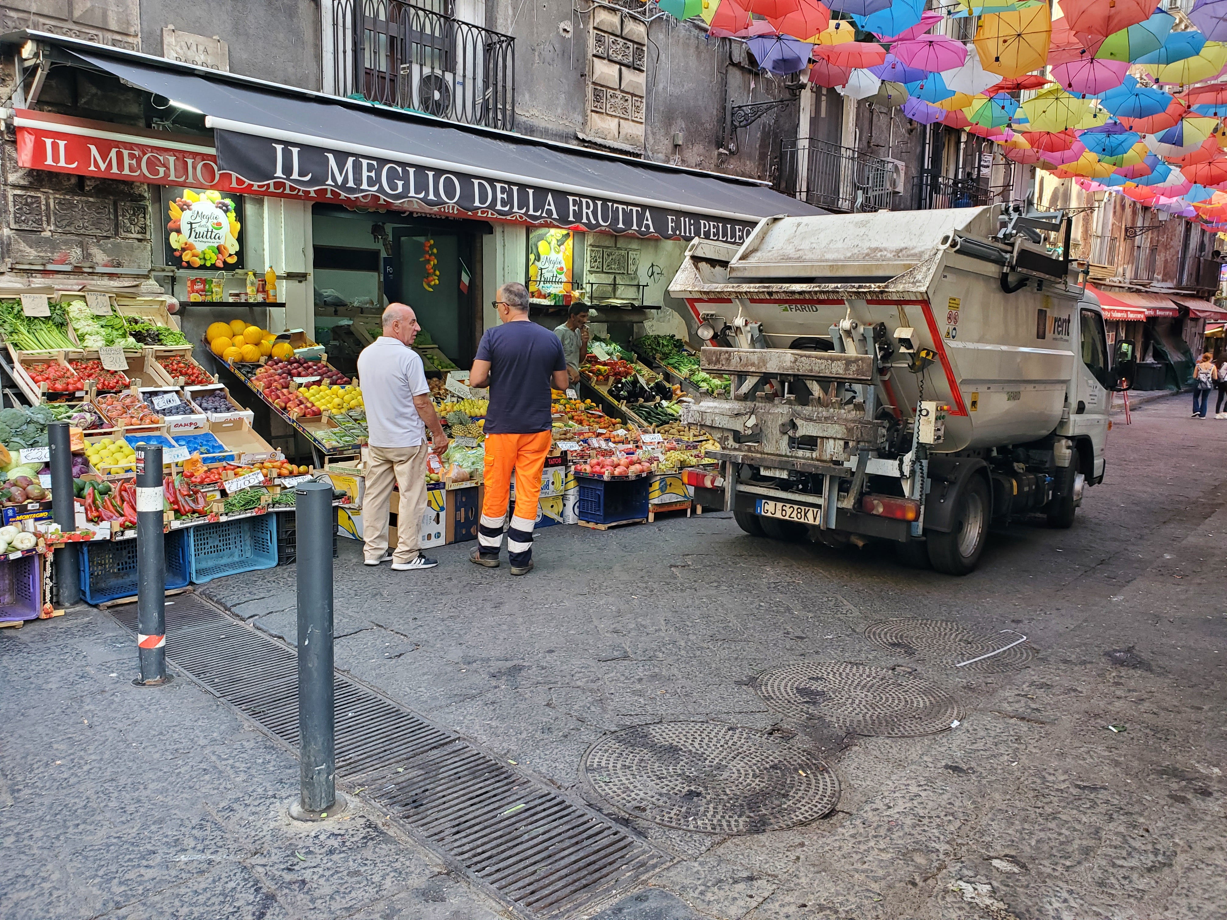 One of the men in the picture lifted those bollards out of the ground, let the tiny trash truck in, and replaced the bollards. Show this to the next person who says car-free streets are not workable because of trash and emergency service.