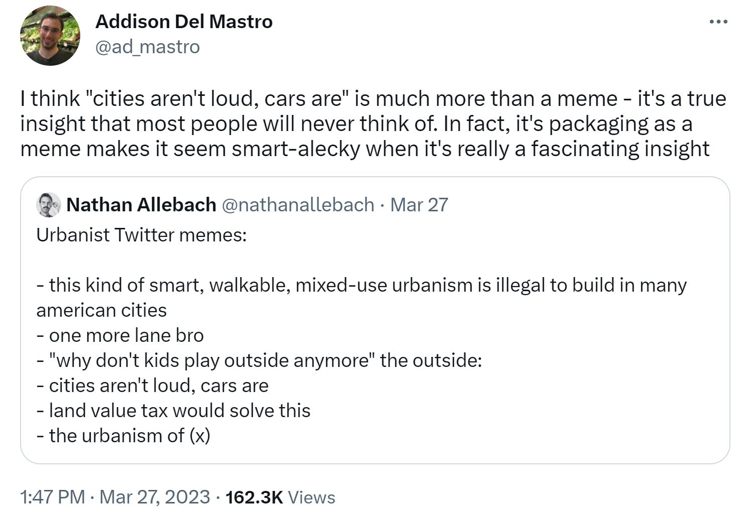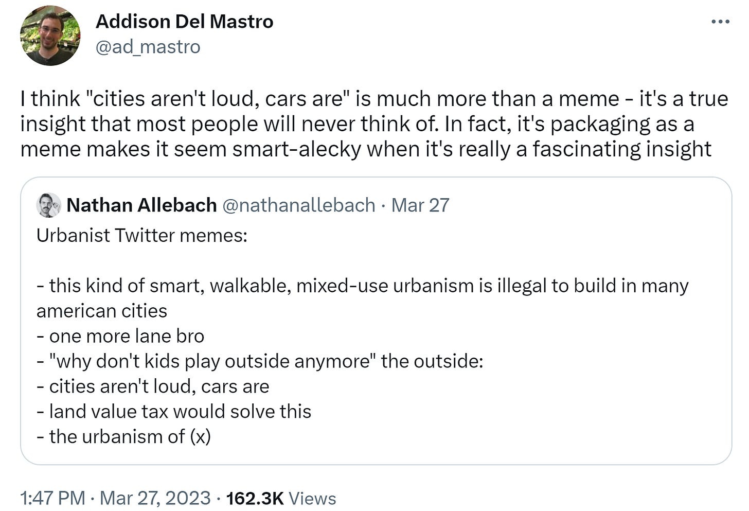 Yeah, I typo’d “it’s,” but the point is, I’m using the word “meme” as basically shorthand for “unserious.” There was a moment—when I was in Croatia and saw how quiet a bustling city could be without motor traffic—I had a sort of “Wait, that stupid meme is actually concealing a real insight!” moment. So much so, I actually headlined that piece “Cities Aren’t Loud, Cars Are Loud”!