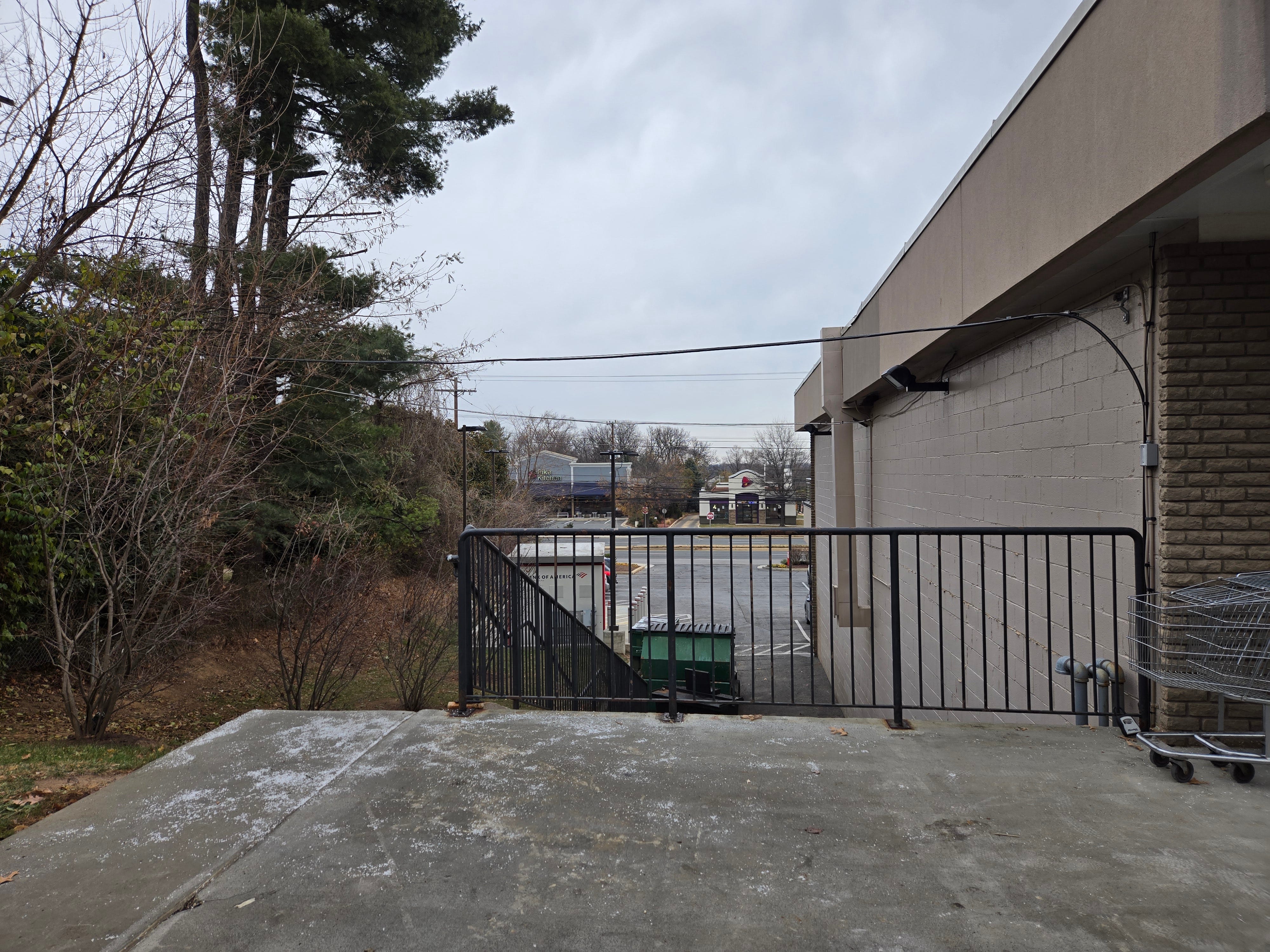 This building even has a ground-level entrance to the second floor, around the back! Here I am, at the top of a staircase that will take you from the parking lot facing Rockville Pike to the back of the building:
