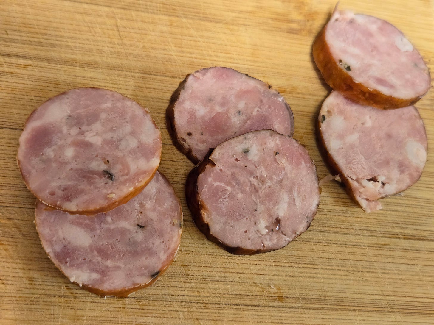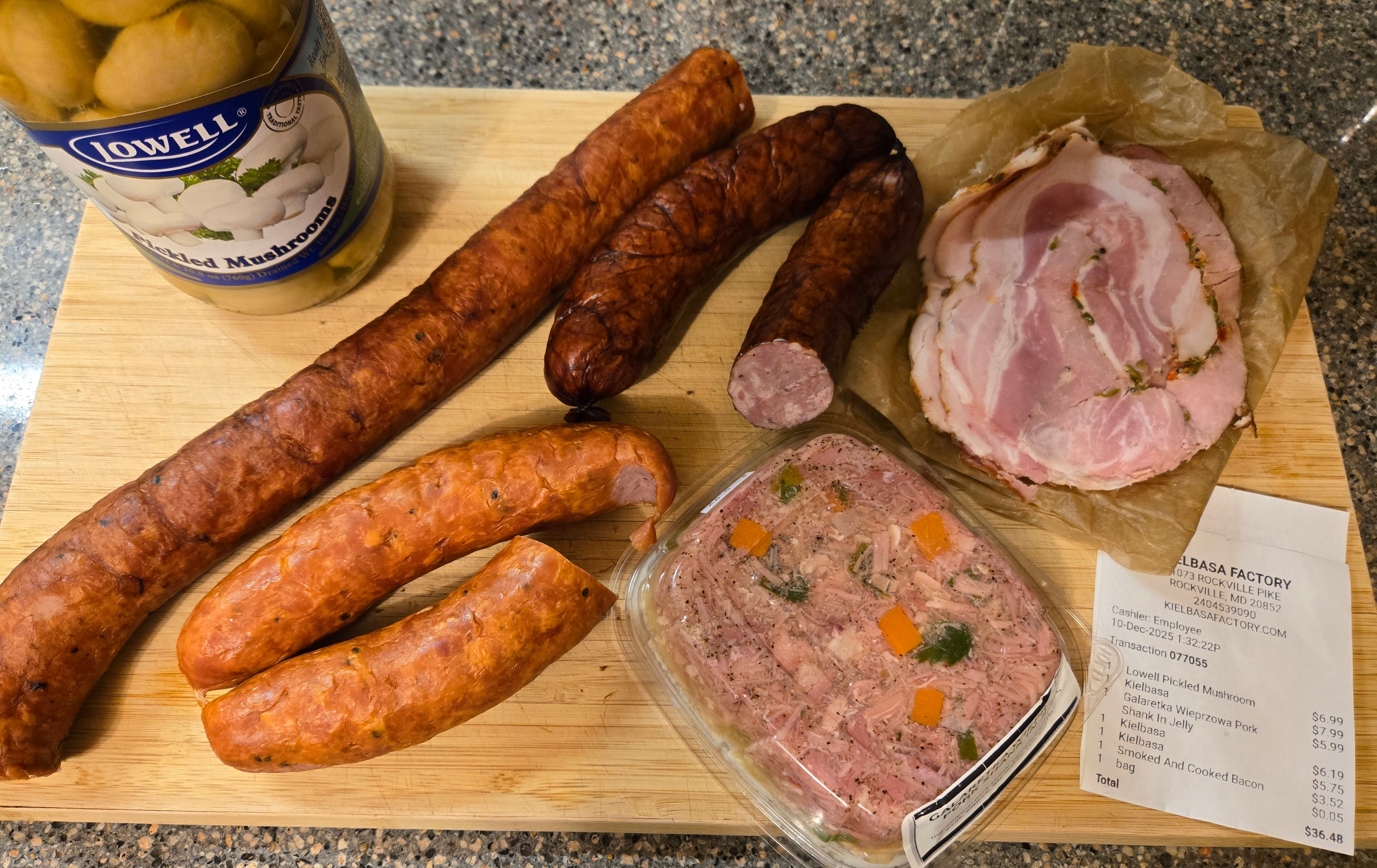 That’s what I paid at the Kielbasa Factory in Rockville, Maryland1 for roughly two link’s worth of three varieties of kielbasa (I’ve already sampled them, which is why the links are not whole!), a bit of spiced rolled bacon, pork in aspic, and a big jar of marinated mushrooms.