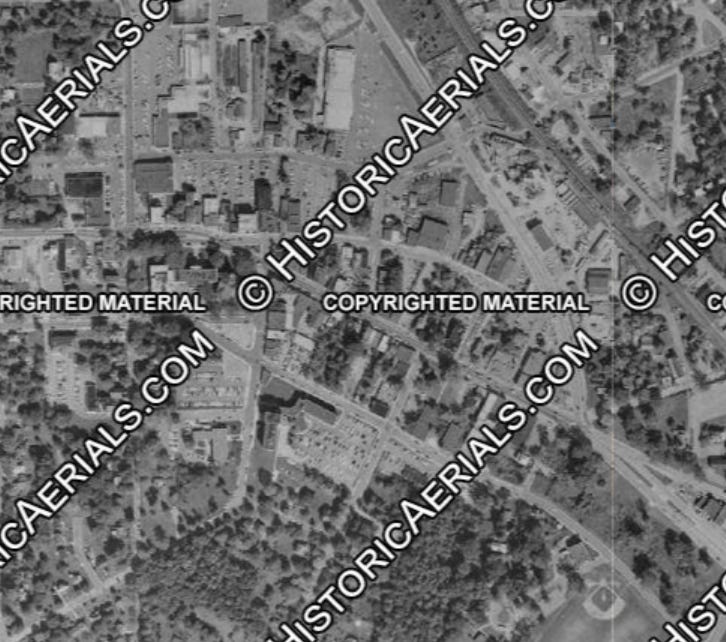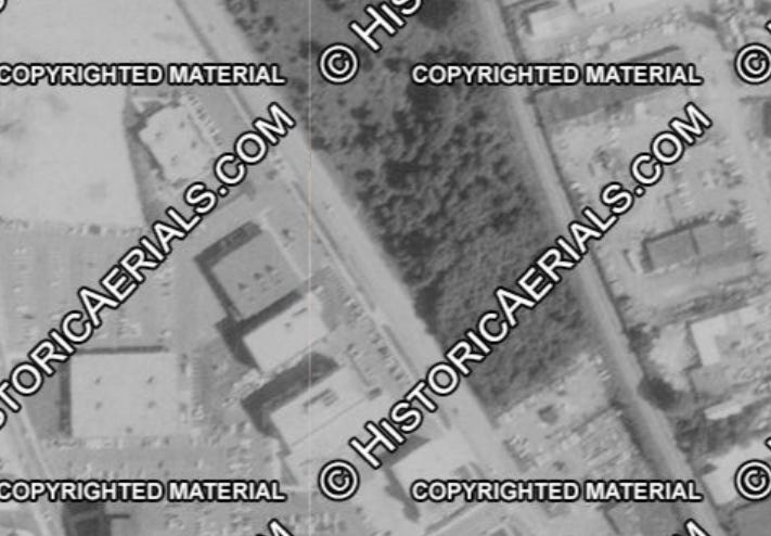 Here it is seen on Historic Aerials, in 1970; it’s the gray-roofed building, just left of the middle of the frame: