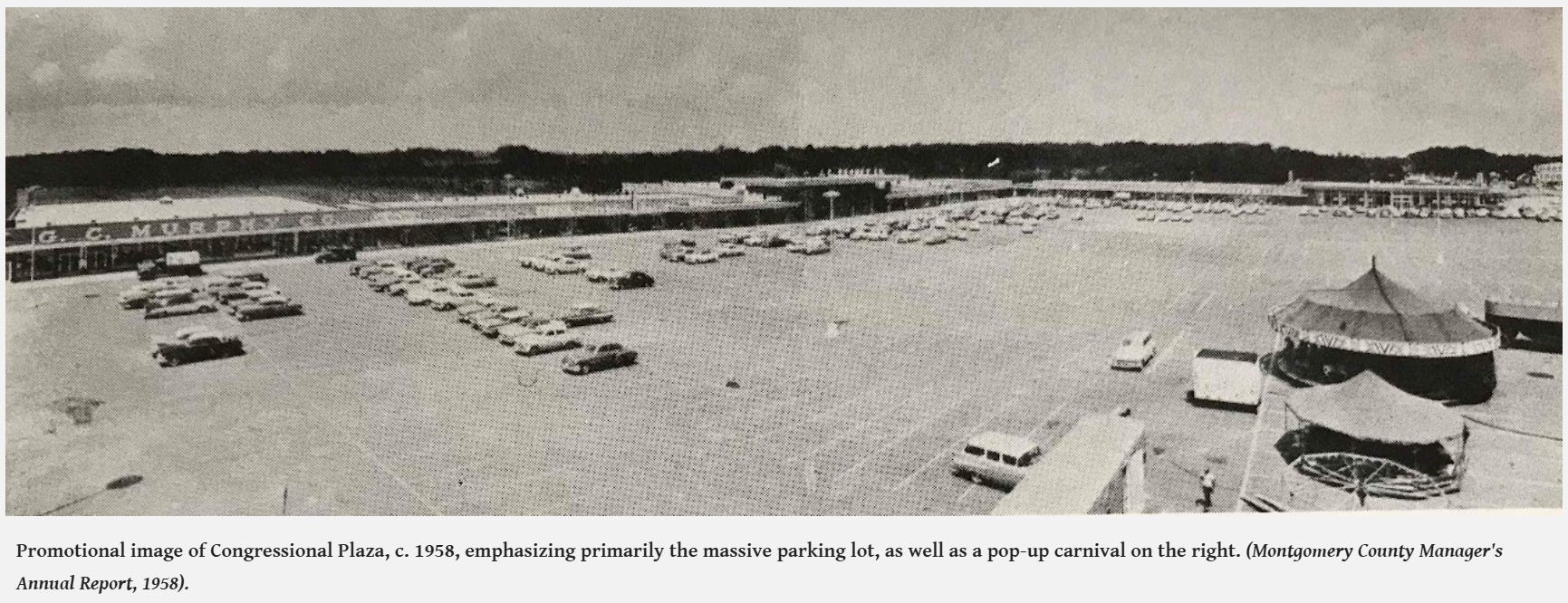 That article includes this photo and description, of a major shopping center in Rockville. It’s interesting that this picture of a quite plain-looking, low-slung strip mall with a huge parking lot was sort of self-evidently exciting and new and great at the time. Today this same photo reads as “depressing, bleak, blank sea of empty asphalt.” (At least it does to me.)