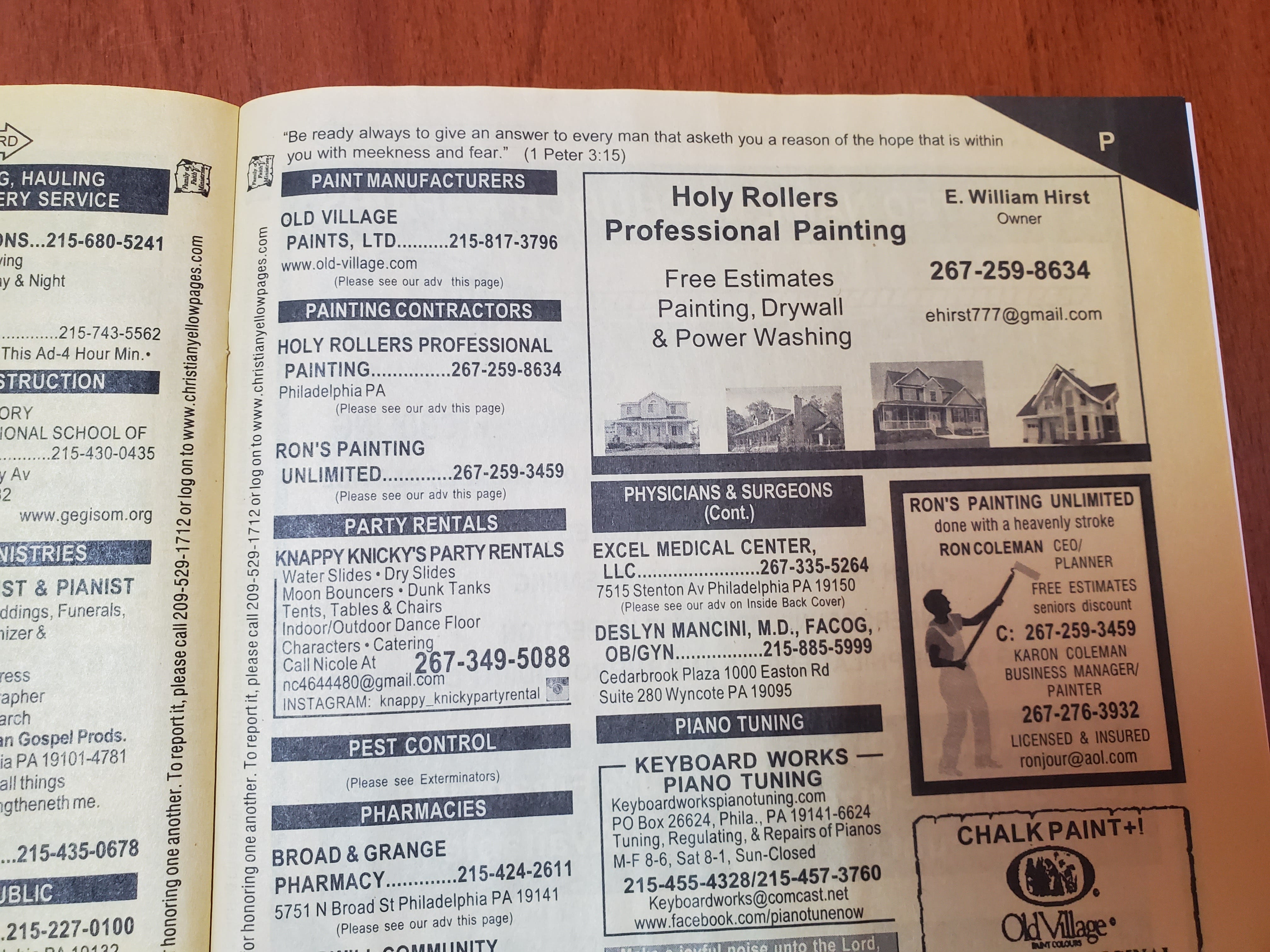 Inside, on a randomly selected page, I found an add for “Holy Rollers Professional Painting”: