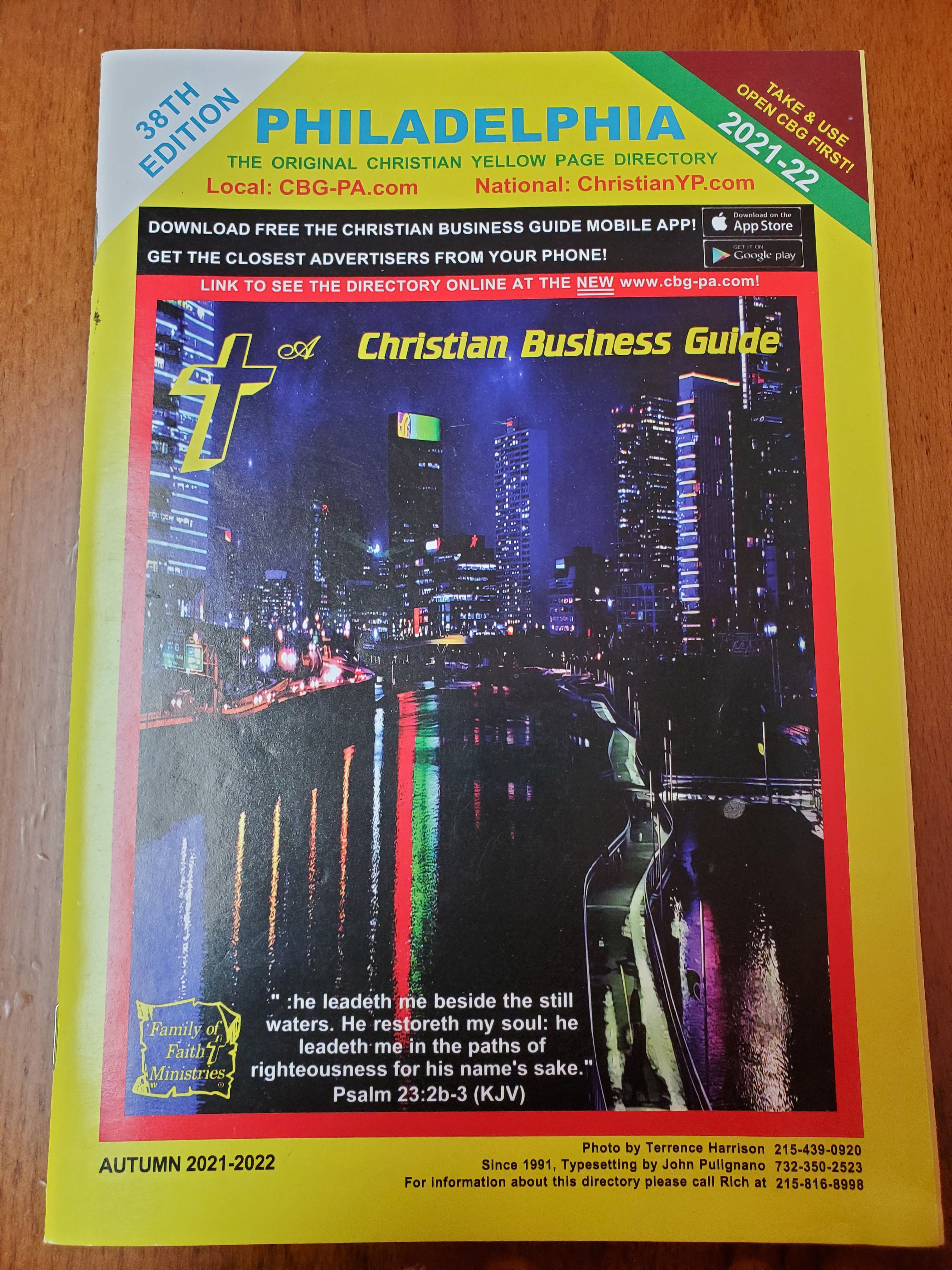 It’s a mini yellow pages of Christian and Christian-owned businesses. At the top of every page is a Bible verse. It’s a little kitschy, but it’s such a distinct thing that a small group of real people obviously made. Look for this sort of thing, and you’ll see it.