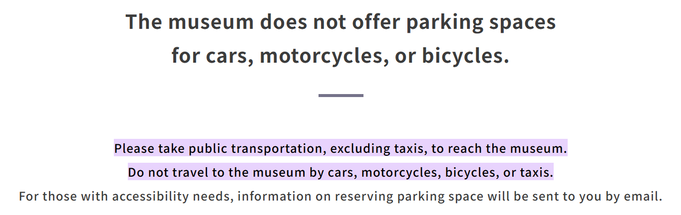 Now I want to contrast that with this, from Japan. On our trip to Japan we visited the Nintendo Museum, in a town outside Kyoto in a kind of warehouse/quasi-industrial district. There is no car parking at the museum, nor, based on this warning from Nintendo, is it likely easy to find a place nearby to leave a car for half a day. Take a look at this: