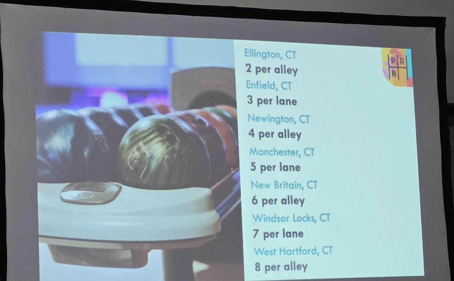 Or, things like this. This, from a parking session I attended at the Strong Towns National Gathering conference in June, shows the parking spaces required for bowling alleys in seven different Connecticut towns and cities. One small state, one type of business, and they all have different numbers of spaces required.