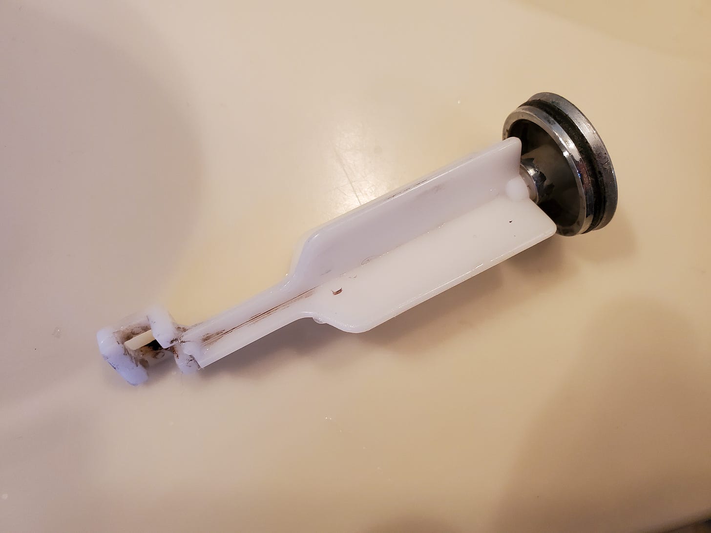 You may or may not know how to remove it. It’s easier to remove than reinstall. You have to undo the little metal clip that connects the rod that controls the stopper with a rod that attaches to the bottom of this piece. Then you have to unscrew a metal piece on the back of the sink pipe to disconnect this piece from th…