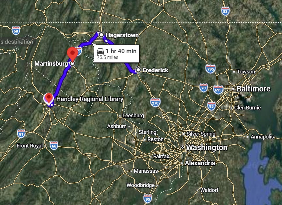 I like these stories just as little vignettes of the development of business concepts in the 20th century. But another interesting thing about this is to see which cities formed a sort of trade area; today both Winchester and Frederick have been to some extent reeled into the D.C. metro area. But at the time, as this suggests, they were more grouped with each other: sort of a broad mini metro area with Hagerstown and Martinsburg. That circuit looks like this on satellite: