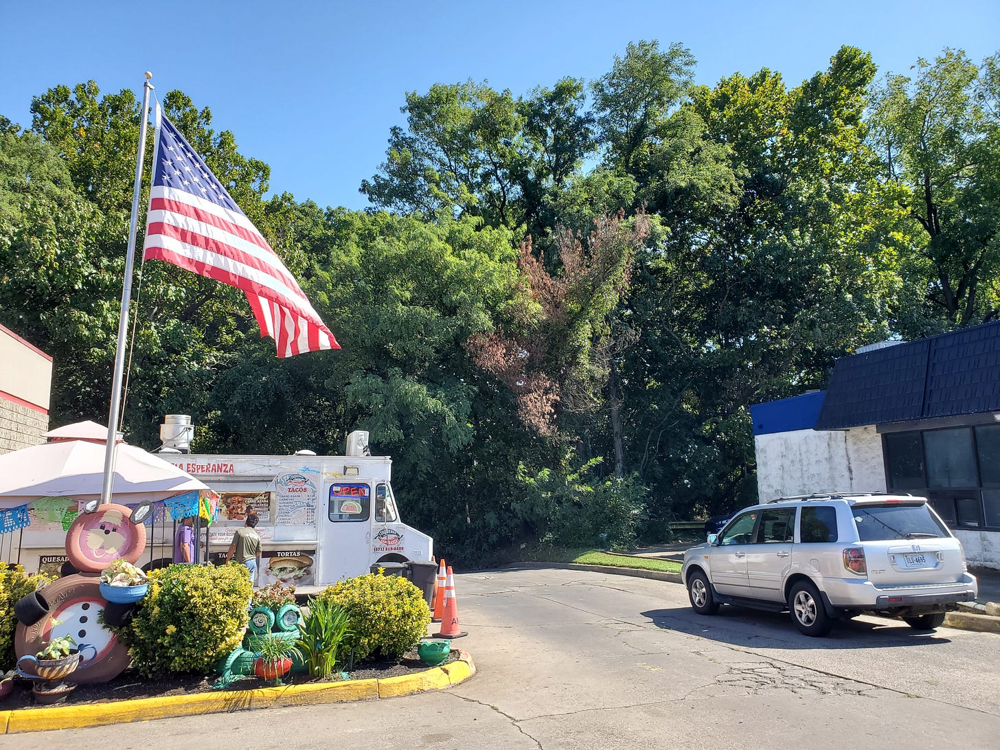It’s a semi-permanently parked truck, sandwiched between an auto garage—it looks like it’s set up on part of their parking lot—and a convenience store that looks like an old Dunkin Donuts.