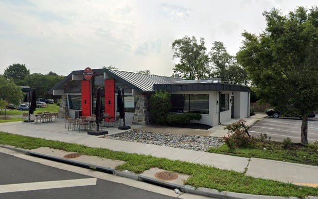 First we’ll do the one in Woodbridge; here it is today. It’s been this burger restaurant for a few months. Take a look at that somewhat odd office-like extension on the right side of the building.
