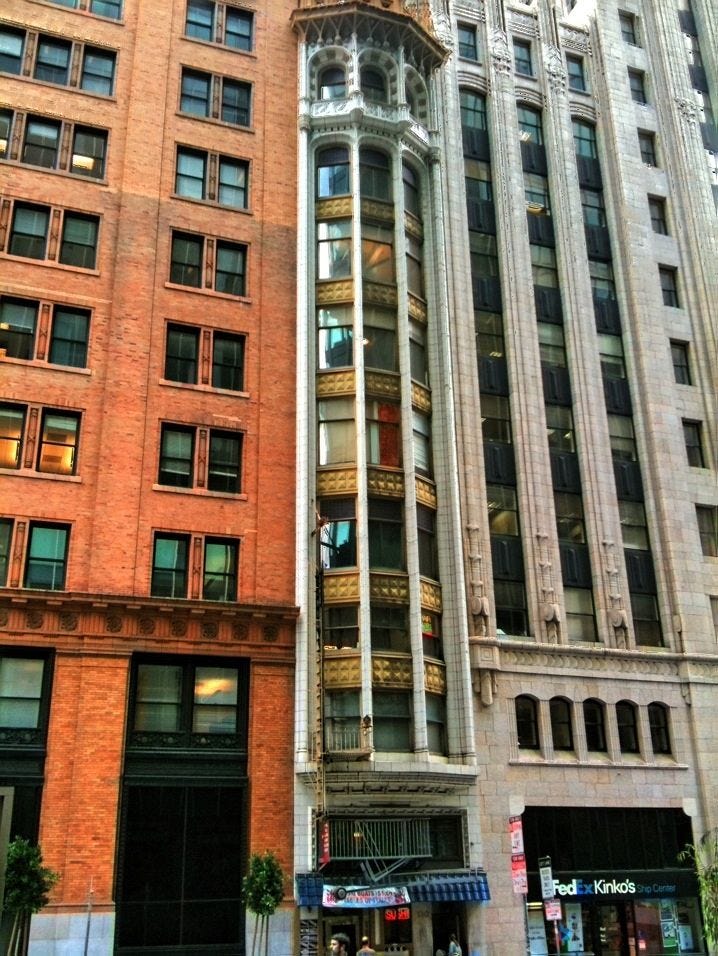 It’s nine stories tall, but only about 20 feet wide. It’s now an office building, with a restaurant in the ground floor space, but it didn’t begin that way.