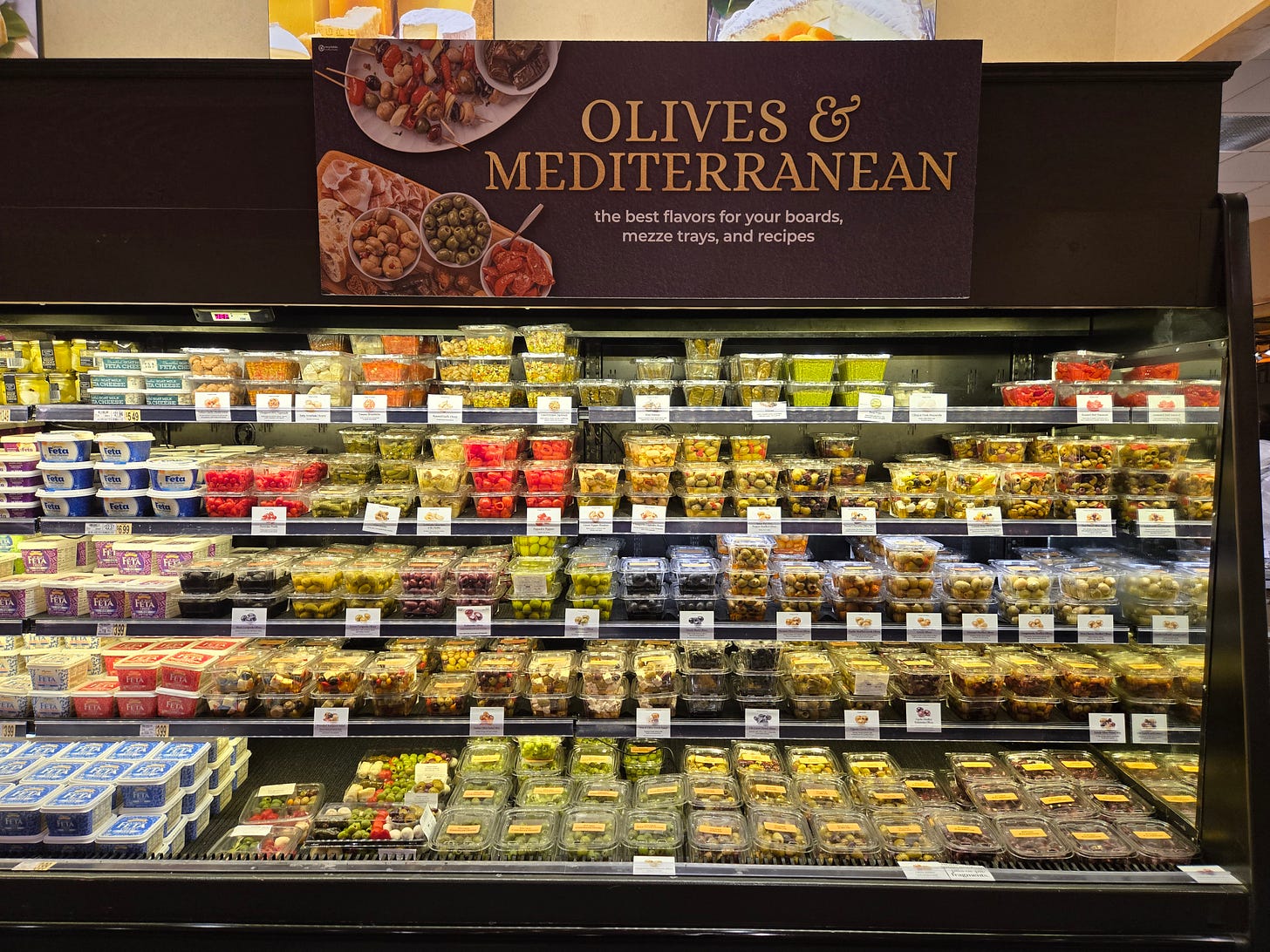 I suppose this is to reduce food waste, or maybe a holdover from COVID (although the new Wegmans was built in 2018). I’m sure it’s also cleaner, and it makes it impossible for kids to stick their hands in the olives, or people to pick one out to sample it, or for the olives to be spilled or mixed together. So as a business/inventory choice, it makes sense.