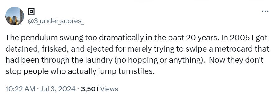 “The funny thing is that *both* of these approaches (treating transit users like presumed criminals, and letting open lawbreaking go unpunished) make tran…