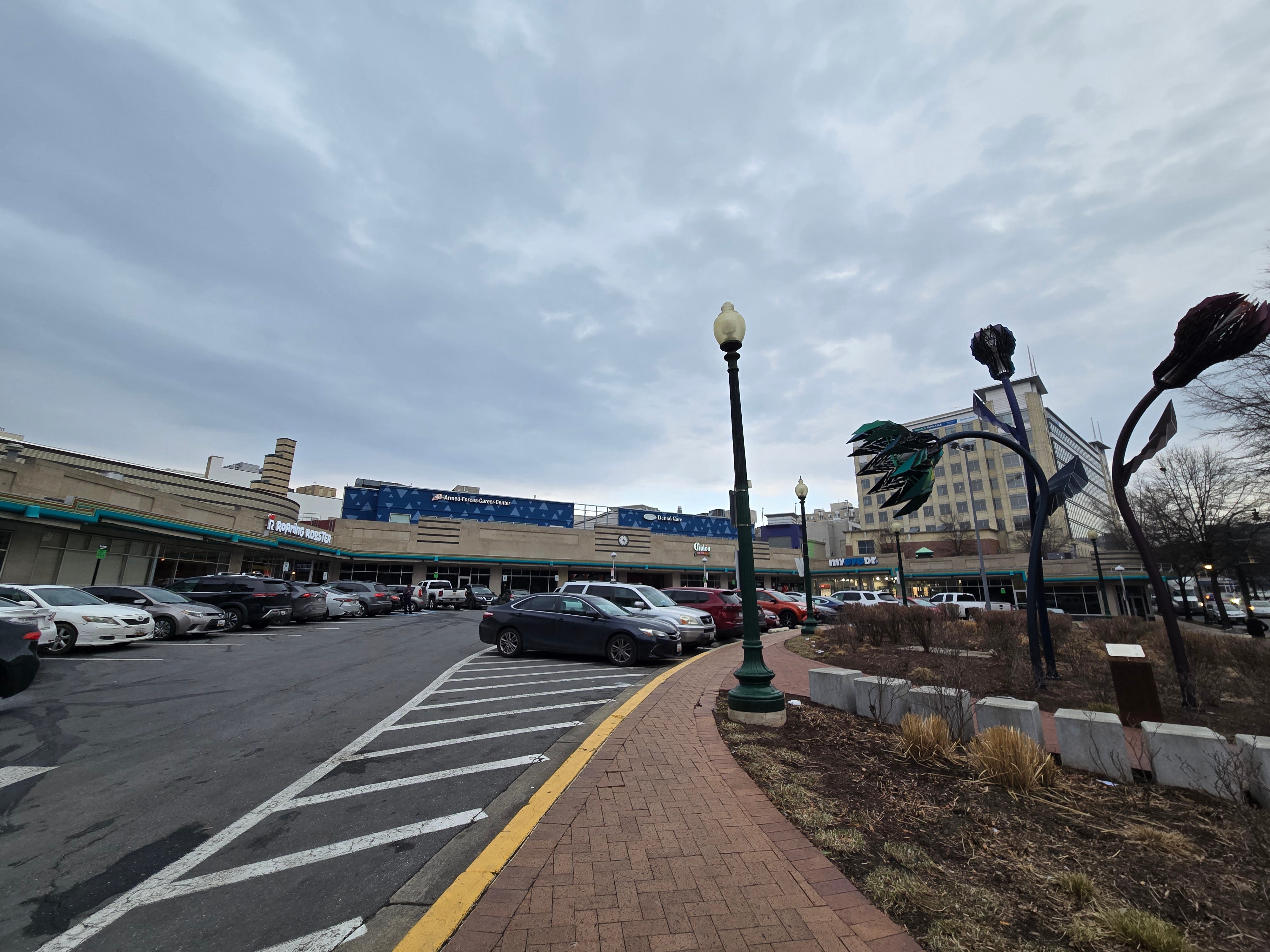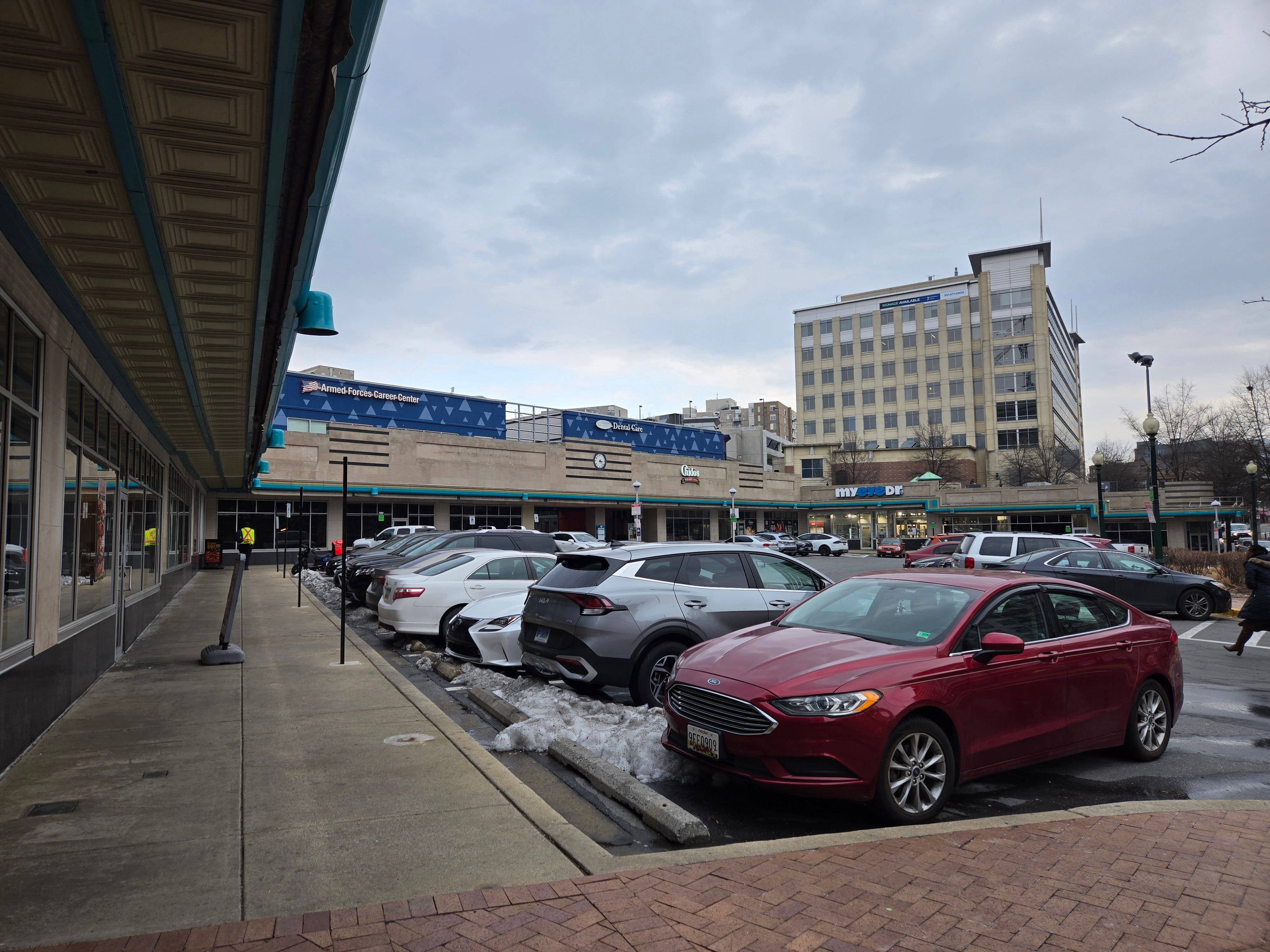 There’s also an attached theater, with that wing of the shopping center fronting the sidewalk directly: