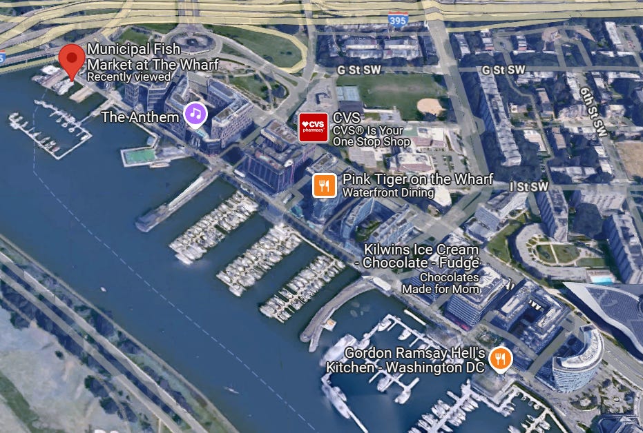 I’ve been to the newish Wharf neighborhood in Washington, D.C. a couple of times—both times, as it happens, for the Greater Greater Washington spring gala. I had actually been here once before, in 2017, when the only notable thing along the water was a floating fish market made of several barges. We had some pretty affordable clams and oysters on the half shell, and it was interesting to be in this kind of liminal space 10 minutes from L’Enfant Plaza but kind of in the middle of…not much.