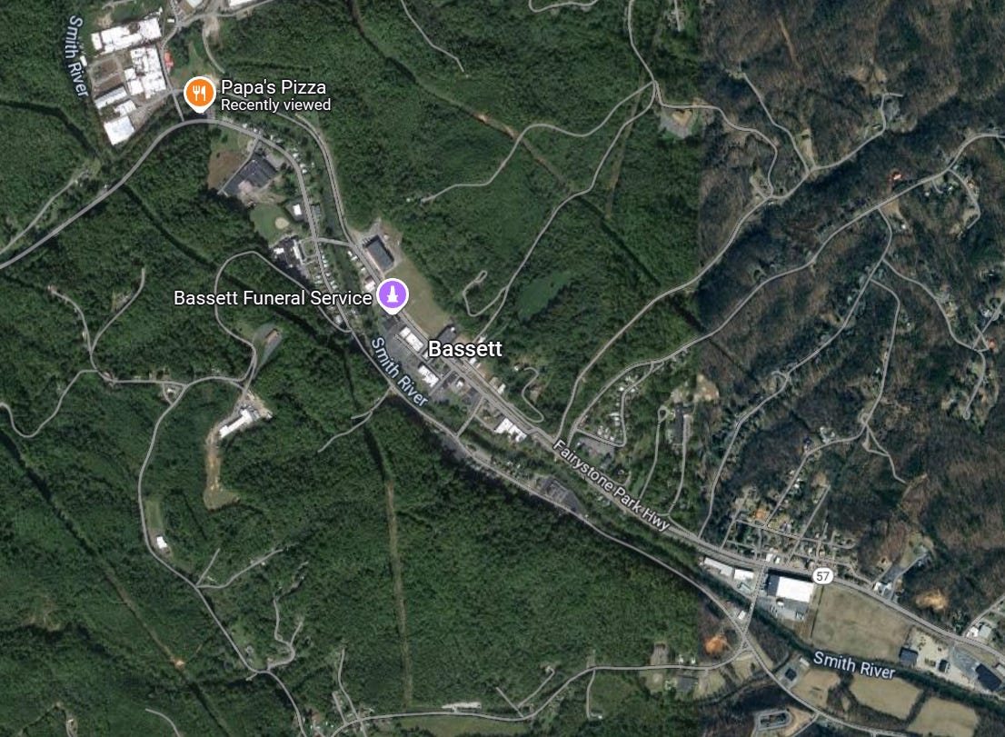 This is the southwestern Virginia town of Bassett, founded by the Bassett family, which later founded Bassett Furniture in 1902. Bassett is still home to Bassett’s headquarters, but the company’s major plant in the town closed in the early 2000s. It is, however, still there: