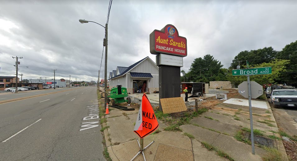 Today we’re in suburban Richmond, Virginia. This time, the structure itself is new, replacing the old one on the site, which you can guess from the sign. The sign was still standing as recently as August, and may still be.