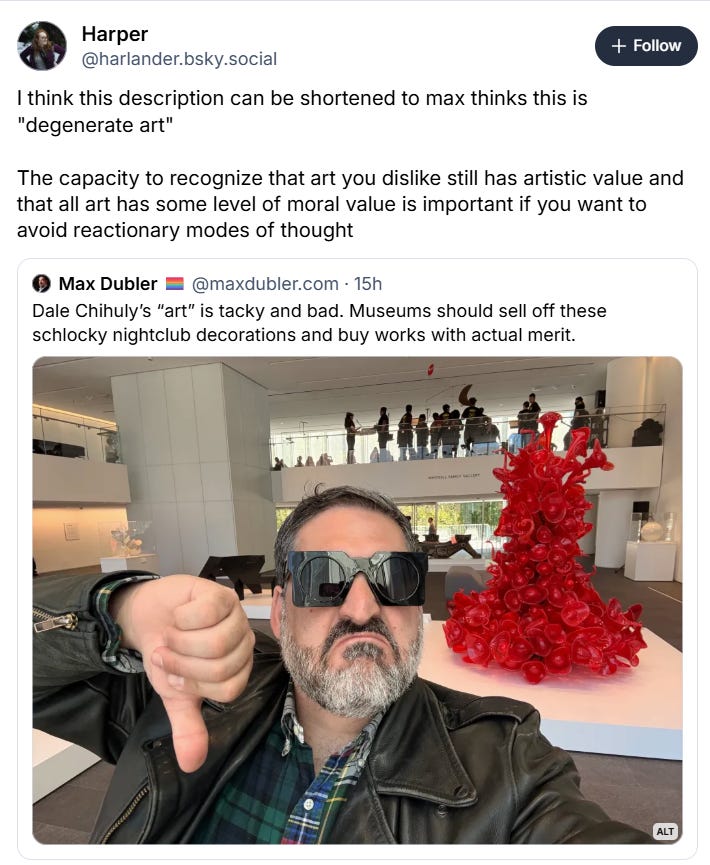 It reminds me of this post I saw on Bluesky the other day, the short of it being that this nobody thinks disliking any kind of art opens you up to being a Nazi, I guess:. It’s basically “Hitler was a vegetarian” from the left.